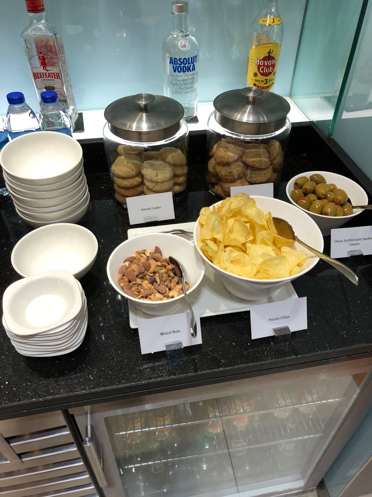 British Airways Galleries Club Lounge Beverage Section - Hard Liquor and Snacks